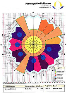Durch die verschieden großen Kreise des Planungsrasters lassen sich die gewünschten Räume nach Größe, Volumen, Ausstattung und Konstruktion u. a. jedes Domsternes tabellarisch ermitteln und übersichtlich und überschaubar kalkulieren.